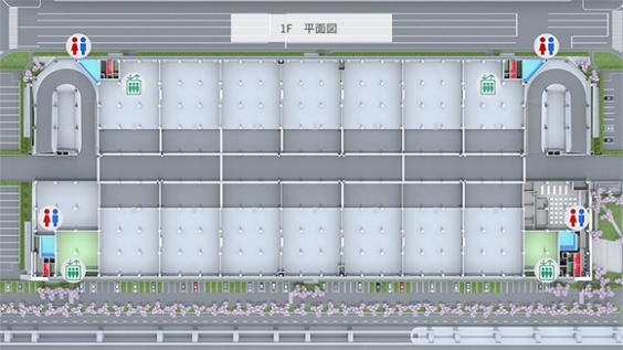 430坪の標準区画をベースに、豊富な電源容量により冷凍・冷蔵設備の設置にも対応(電源増設は別途費用)。さらに、レストランや休憩所、コンビニなどの充実したサービス施設も併設。