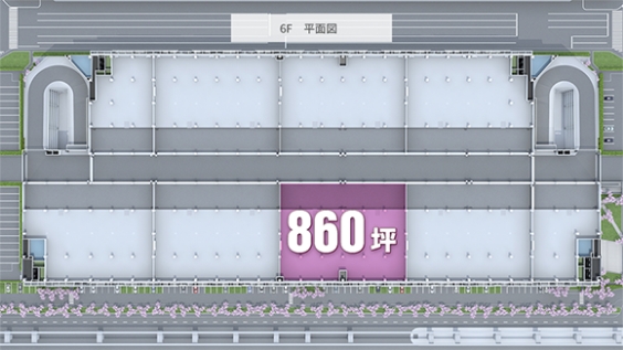 6階のみ柱の30%減により860坪の大空間を実現。有効スペースの拡張により自由度の高いレイアウトに対応。